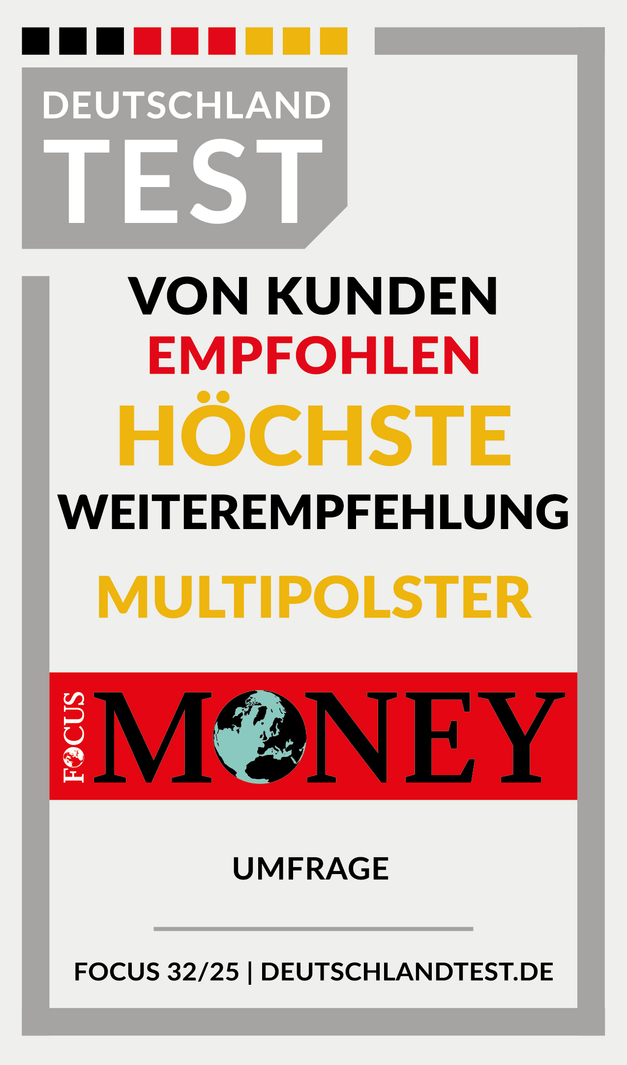 MULTIPOLSTER Wiederholt AUSGEZEICHNET! Multipolster legt großen Wert auf hervorragende und kompetente Beratungsqualität sowie erstklassigen Kundenservice und bietet damit ein rundum angenehmes und erfolgreiches Einkaufserlebnis. 50 Filialen in Deutschland, 30 Jahre Erfahrung und 2 Millionen zufriedene Kunden geben uns Recht. Jedes Jahr wird dies auch von unabhängigen Organisationen und Instituten bestätigt. So weisen laut Focus Money innerhalb der Polstermöbelbranche die höchste Weiterempfehlungsquote auf und wurden vom Handelsblatt als bester Händler ausgezeichnet. Wir sind stolz auf jede Auszeichnung. Überzeugen Sie sich selbst!