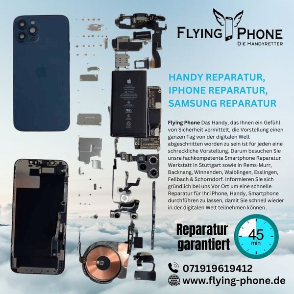Handy Reparatur Backnang - Flying-Phone ist Ihr vertrauensvoller Ansprechpartner, wenn es um schnelle, zuverlässige und preiswerte Smartphone-Reparaturen im Herzen von Backnang und im gesamten Rems-Murr-Kreis geht. Egal, ob es sich um einen Displaybruch, einen schwachen Akku, Probleme mit der Ladebuchse, Wasserschäden oder Softwarefehler handelt - unser erfahrenes Team bringt Ihr Gerät im Handumdrehen wieder in Bestform. Wir reparieren alle gängigen Marken wie iPhone, Samsung, Xiaomi, Huawei, Oppo und viele weitere. Dabei setzen wir ausschließlich auf originale Ersatzteile und modernste Technik, um Ihnen höchste Qualität und Langlebigkeit zu garantieren. Für besonders eilige Fälle bieten wir einen Express-Service, damit Sie Ihr Smartphone oft schon am selben Tag zurückbekommen. Neben unserem Vor-Ort-Service in Backnang können Sie Ihr defektes Handy auch bequem per DHL einsenden - schnell, unkompliziert und sicher. Viele Kunden aus Backnang und dem gesamten Rems-Murr-Kreis vertrauen bereits auf Flying-Phone, wenn es um Handy Reparatur Backnang geht. Besuchen Sie uns in unserer Filiale oder rufen Sie direkt an - wir kümmern uns persönlich um Ihr Anliegen. Wenn Sie Wert auf Qualität, Vertrauen und lokalen Service legen, ist Flying-Phone Ihre erste Wahl für Handy Reparatur Backnang.