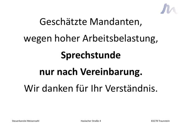 Geschätzte Mandanten,aufgrund der hohen Arbeitsbelastung können wir Ihnen leider nur Sprechstunden nach Vereinbarung anbieten.Unterlagen können Sie uns aber gerne ohne Vorankündigung vorbeibringen.Wir danken Ihnen sehr für Ihr Verständnis. Geschätzte Mandanten,aufgrund der hohen Arbeitsbelastung können wir Ihnen leider nur Sprechstunden nach Vereinbarung anbieten.Unterlagen können Sie uns aber gerne ohne Vorankündigung vorbeibringen.Wir danken Ihnen sehr für Ihr Verständnis.