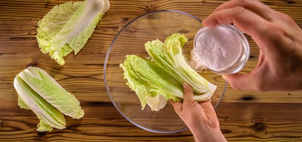 Chinakohl putzen und mit einem Messer längs vierteln. Kohl-Viertel in eine Schüssel legen. Großzügig Salz darüber streuen. Danach die Blätter einzeln mit Salz einreiben. Für 2 - 5 Stunden in der Schüssel lassen, sodass Wasser aus dem Kohl austritt und er etwas welk wird. Zwischendurch wenden.