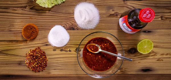 Während der Kohl ruht, stellen Sie die Marinade zum Fermentieren des Kohls her: Fischsoße, Limettensaft, Zucker, Chili und Paprikapulver verrühren.