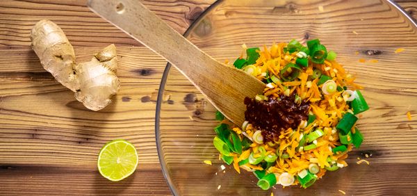 Knoblauch und Ingwer fein hacken. Zur Paste geben. Lauchzwiebeln in Ringe schneiden, auch das Grün. Ebenfalls dazugeben. Möhre raspeln.