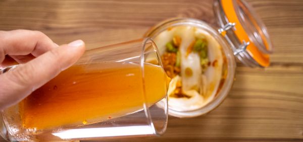 Den Rest der Marinade aus der Schüssel mit wenig Wasser vermischen und über den Kohl gießen. Das Kimchi sollte vollständig mit Flüssigkeit bedeckt sein.